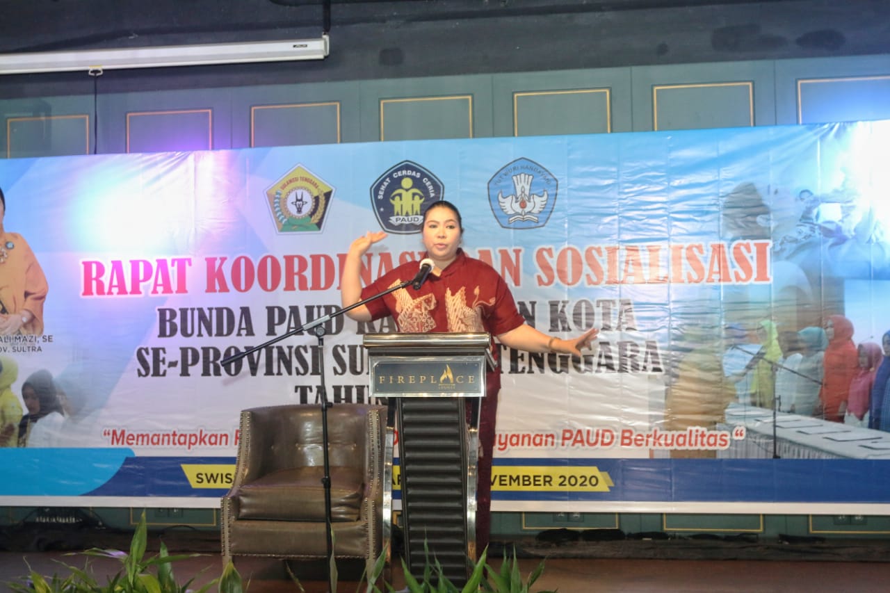 Kendari, Sulawesibersatu.com – Bunda Pendidikan Anak Usia Dini (PAUD) Provinsi Sulawesi Tenggara (Sultra) Agista Ariany Ali Mazi membuka Rapat Koordinasi (Rakor) dan Sosialisasi Bunda PAUD Kabupaten/Kota se-Provinsi Sulawesi Tenggara Tahun 2020 di Hotel Swissbel, Kendari, 16 November 2020. Rakor ini dijadwalkan berlangsung selama dua hari.
