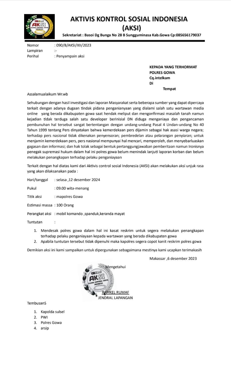 Hal ini diungkapkan Jenderal Lapangan AKSI, Rafikel Rumaf dengan melayangkan Surat Penyampaian Aksi dengan Nomor : 090/B/AKSI/XII/2023 kepada Polres Gowa melalui Satuan Intelkam pada Rabu (6/12/2012) tadi.