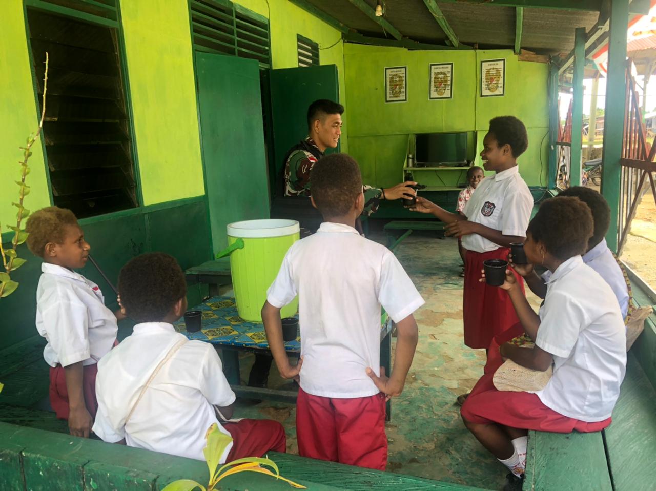 Boven Digoel,sulawesibersatu.com – Peduli pada pertumbuhan dan gizi generasi Papua, satgas Yonif 725/Wrg Pos Koki B/Mindiptana memberikan tambahan gizi berupa minuman bubur kacang hijau kepada generasi muda yg akan menuju ke sekolah,Bertempat di Pos Koki B/Mindiptana, Kampung Osso, Distrik Mindiptana, Kab.Boven Digoel, Papua Selatan.