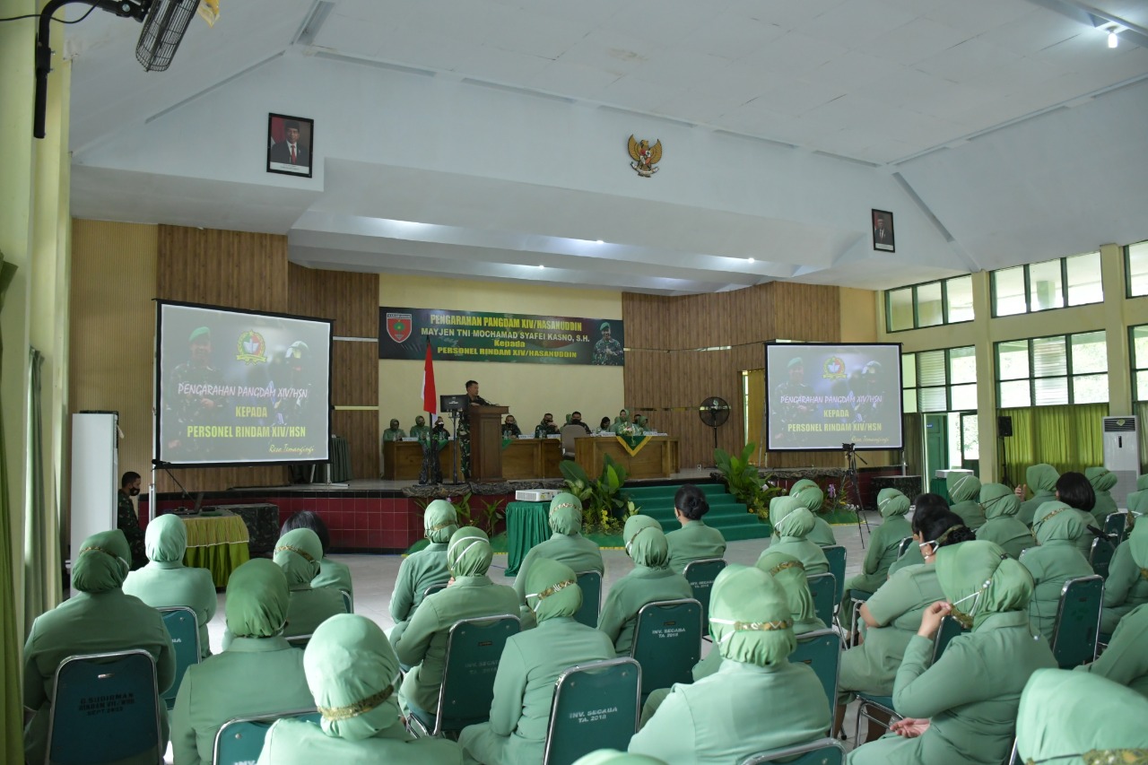 Pakato,Sulawesibersatu.com – Pangdam XIV/Hasanuddin Mayjen TNI Mochamad Syafei Kasno, S.H., berikan pengarahan personel Rindam dalam rangka kunjungan kerjanya di Satuan Rindam XIV Hasanuddin, Jl Poros Malino kab Gowa, Sabtu ( 10/04).
