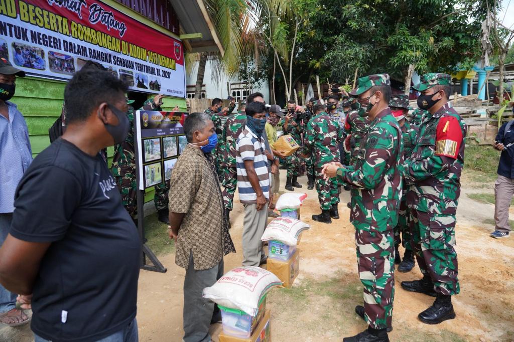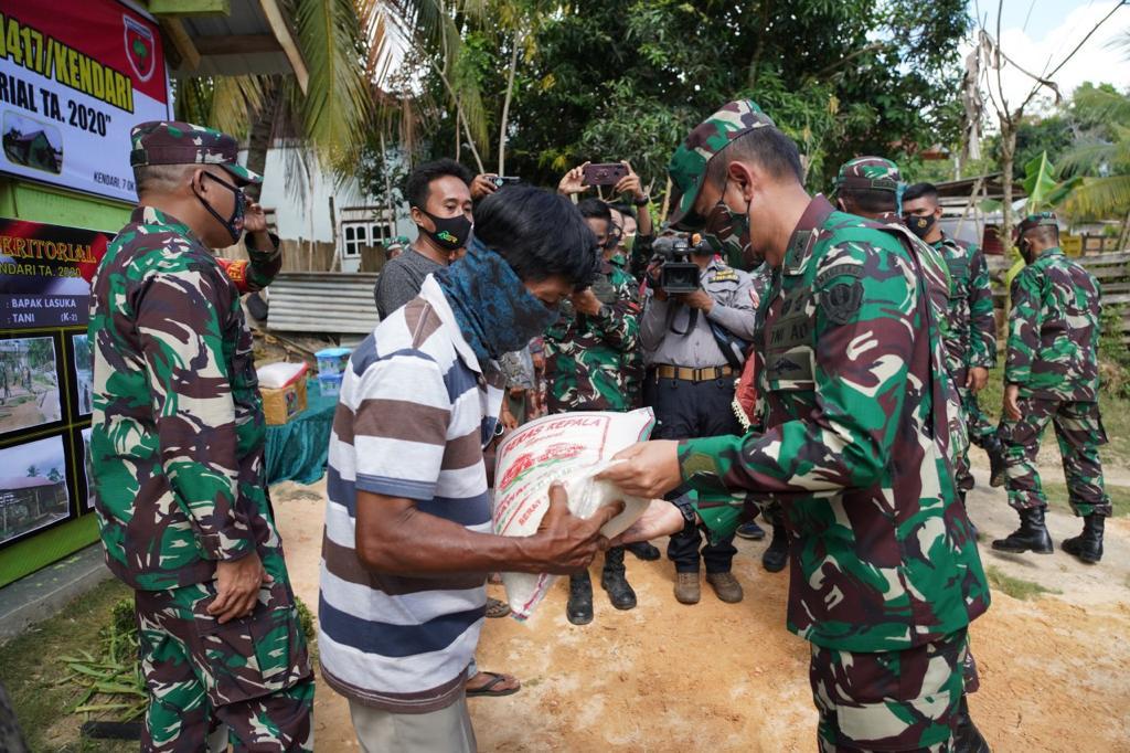 “Aster Kasad beserta rombongan meninjau lokasi serbuan teritorial dari pembangunan rehab RTLH Pak Baharudin (Nelayan Kampung Bajo) di Kampung Bajo, Pak La Suka (Petani) Kel. Petoaha Atas, Nambo dan dilanjutkan dengan pembagian sembako,” terang Kapenrem.