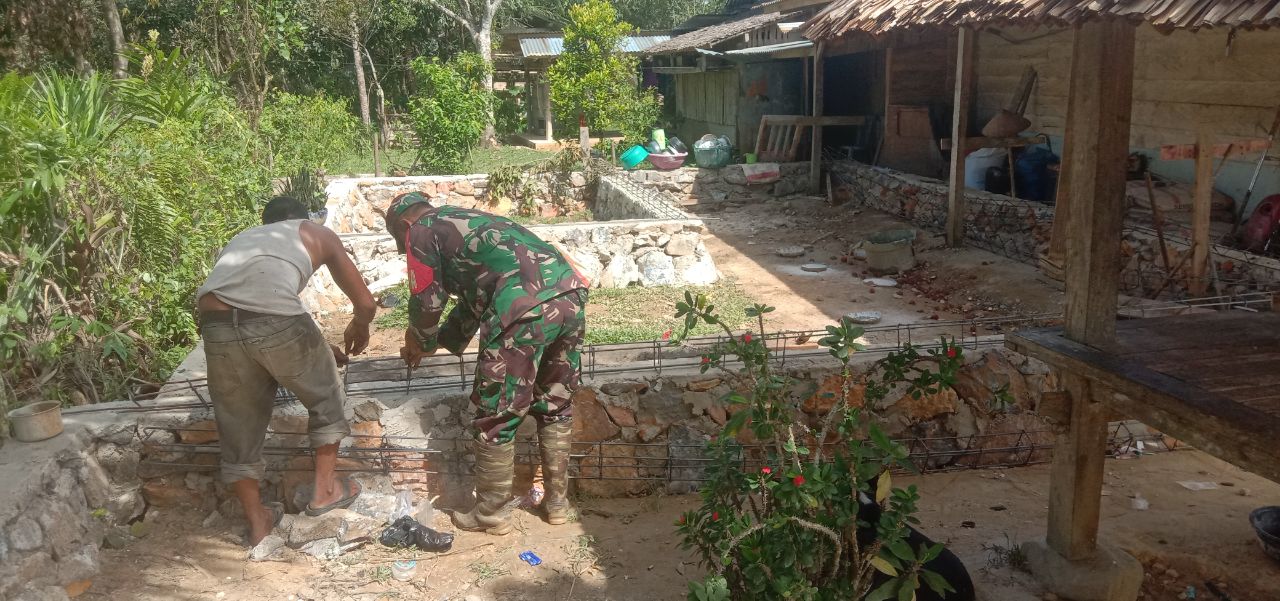 Dalam kegiatan tersebut babinsa bersama para warga membantu perakitan besi cor tiang rumah dalam rangka pembangunan rumah salah satu warga binaannya.