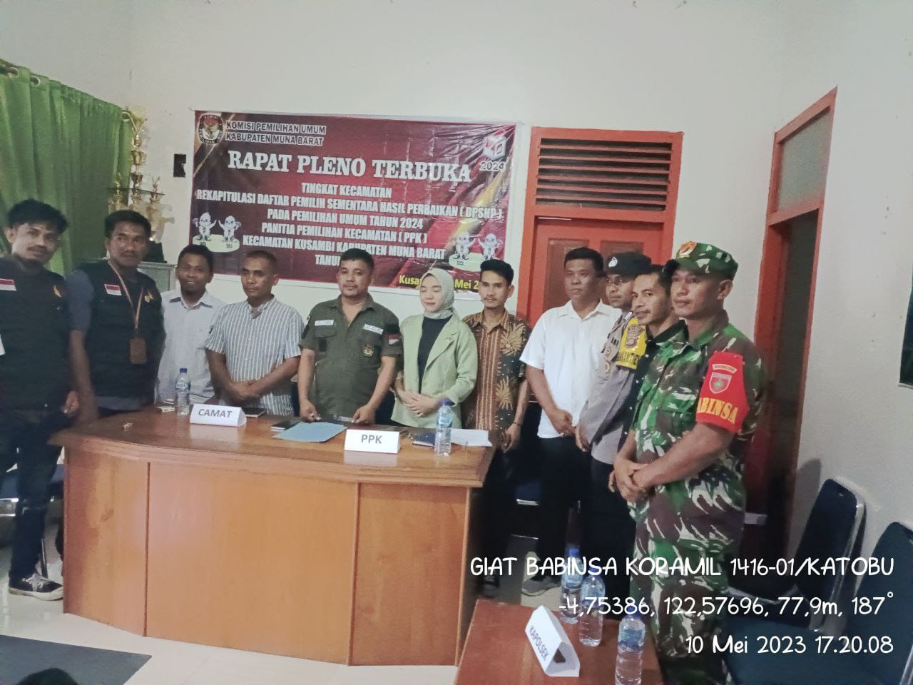 Muna,Sulawesibersatu.com–Babinsa Koramil 1416-01/Katobu Kodim 1416/Muna, Koptu Muh. Ramadhan mendampingi Hadiri Acara Rapat Rekapitulasi daftar pemilih sementara Tingkat Kecamatan Kusambi bersama Anggota PPS yang bertempat di Kantor Kecamatan Kusambi desa Kusambi Kec. Kusambi Kab. Muna Barat, (11/5/2023).