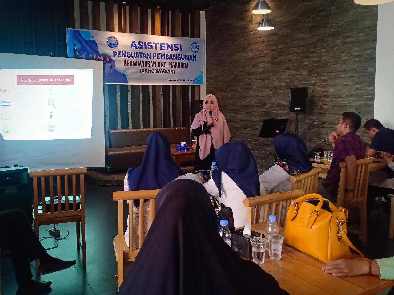 Selanjutnya Ibu Herlina Azikin SH. MH kabid P2M BNNK Bone Membawakan materi tentang RELAWAN kemudian pemateri terakhir Yusni Sainal S. K.M.kes bawakan materi Rencana Aksi pencegahan dan simulasi