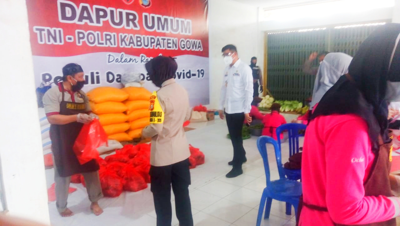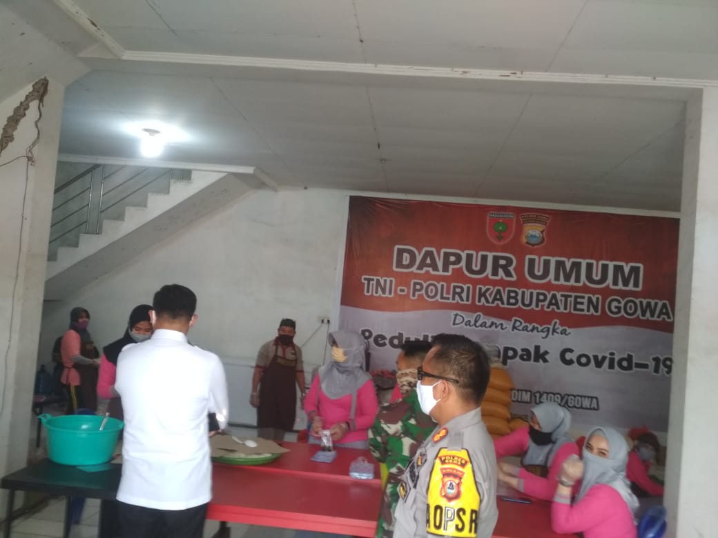 Dalam peninjauan yang dilakukan tampak Kapolres Gowa menjelaskan tentang aktifitas yang dilakukan para Polwan, ASN dan Personil Kodim 1409 Gowa sepanjang dibukanya dapur umum peduli dampak Covid-19 TNI Polri pasca merebaknya virus Corona di Kabupaten Gowa.