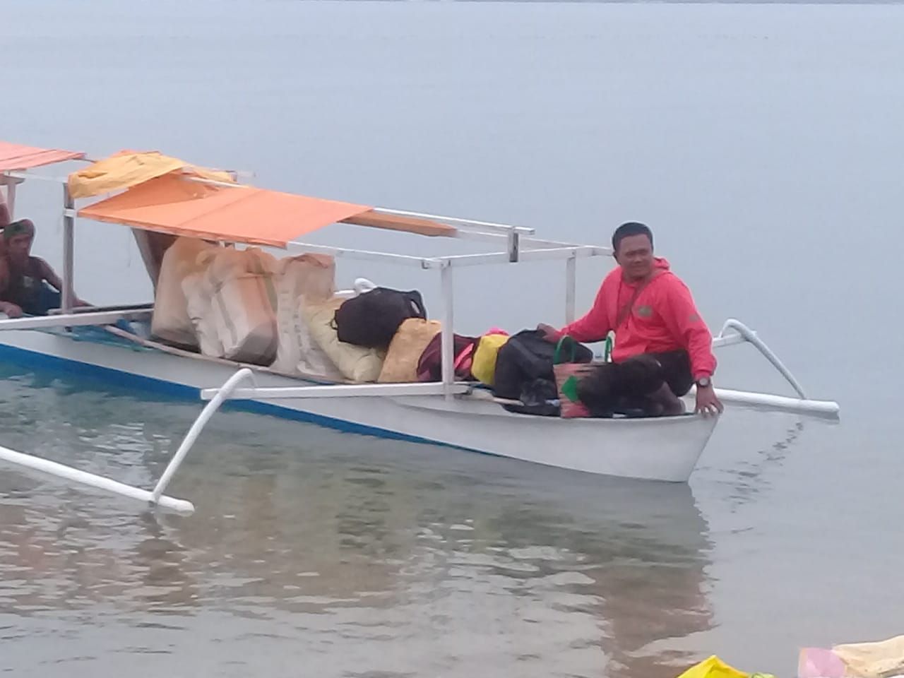Bapak Kades bersama Danposal melakukan pemeriksaan terhadap warga banangan serta menghimbau bagi penumpang yang orang tua untuk tidak turun dari kapal sebelum dilaksanakan pemeriksaan dulu serta barang diturunkan harus dengan menggunakan perahu kecil.