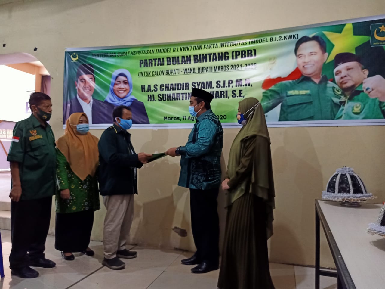Penyerahan surat keputusan (SK) model B.1.KWK dan Fakta Integritas model B.1.2.KWK dilakukan Ketua DPW PBB Sulsel, Ir. H Badaruddin P Sabang didampingi Ketua DPD PBB Maros, Hj. Suriati, Selasa, (11/08) di posko induk pemenangan Hatikita Keren, Poros Maros-Mks, KM 3 Maros