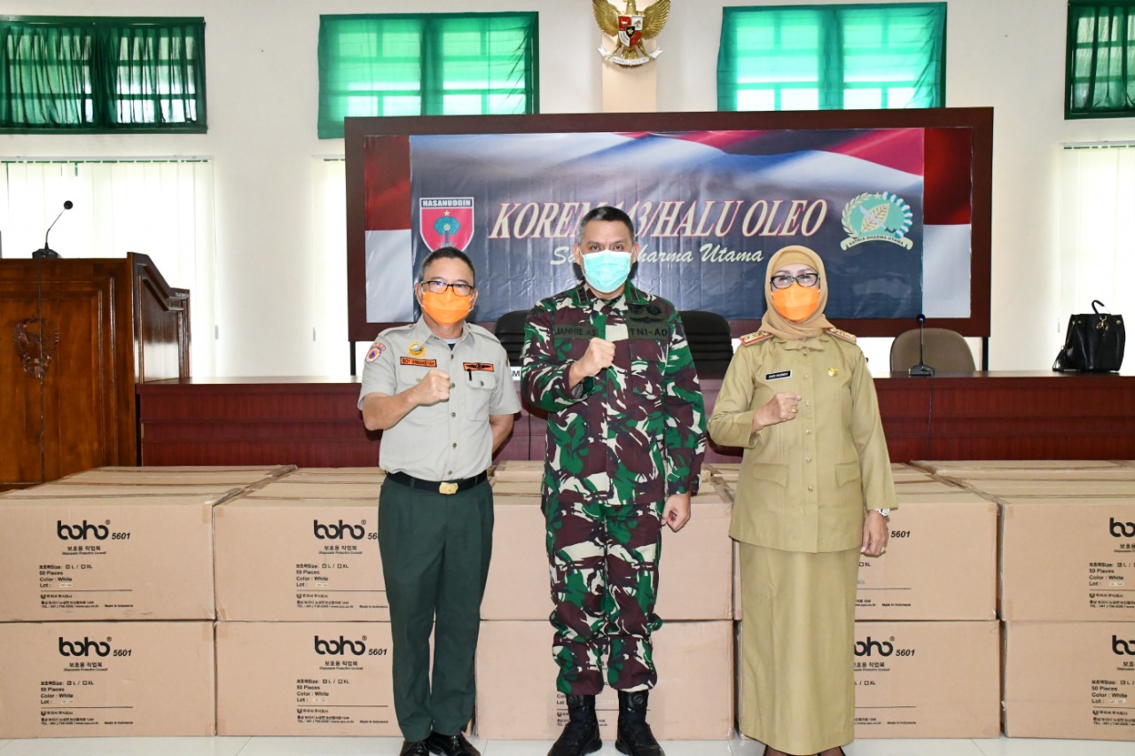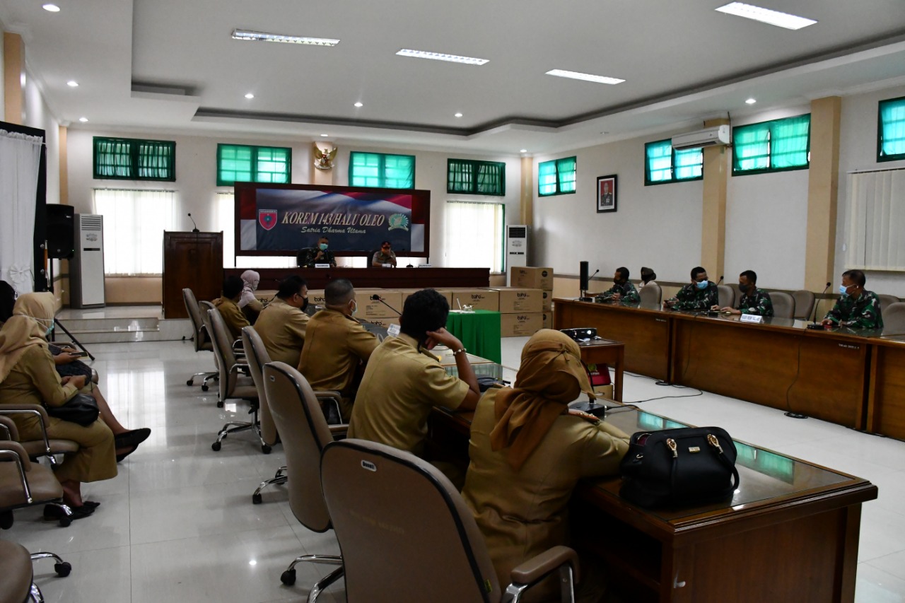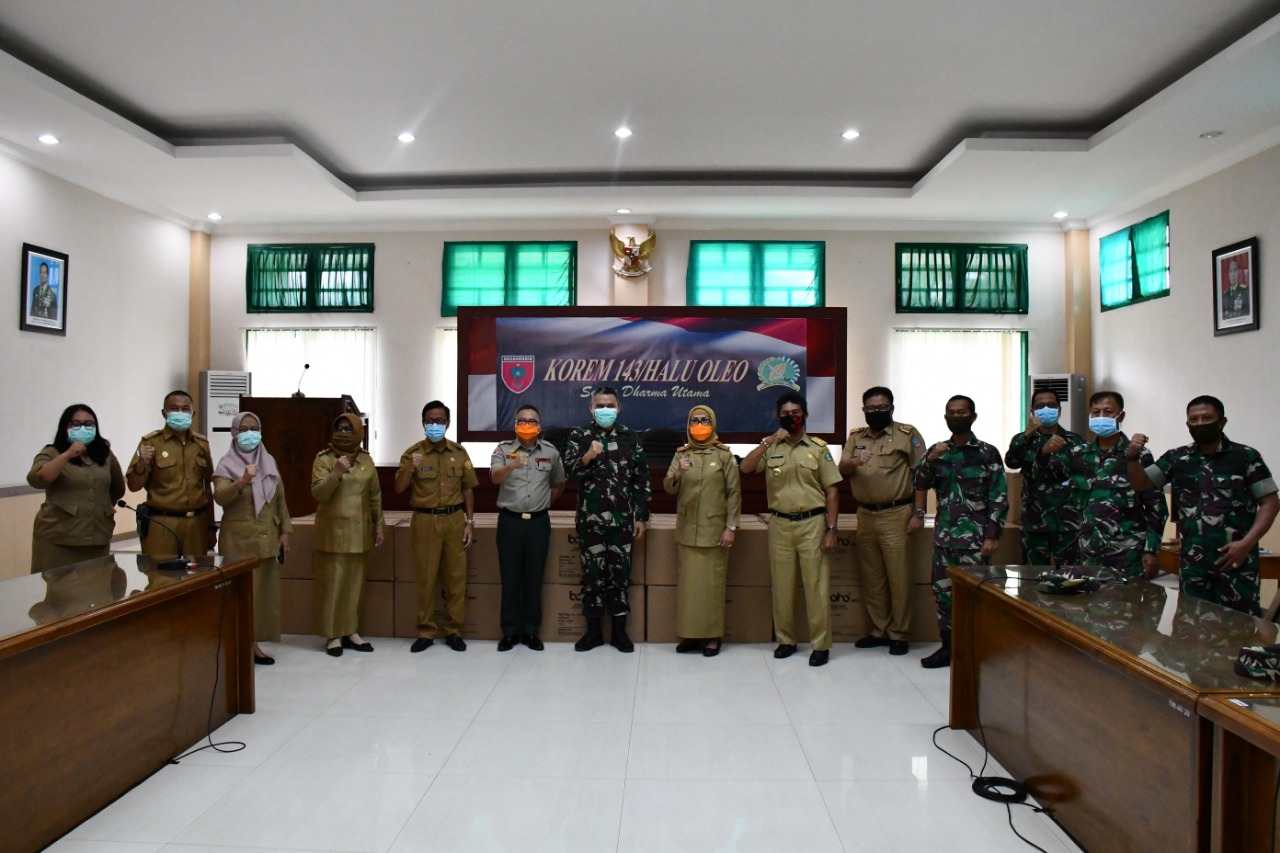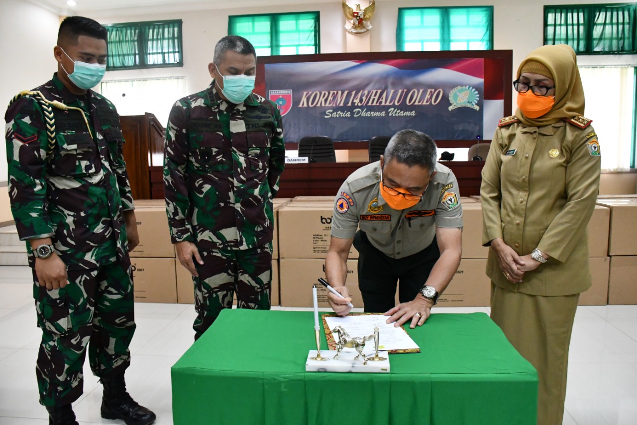 Kendari,Sulawesibersatu.com – Senin 4 Mei 2020 di Aula Tamalaki Korem 143/HO Jln. Drs. H. Abdullah Silondae No. 242 Kel. Korumba Kec. Mandonga Kota Kendari Prov. Sultra, dilaksanakan penandatanganan naskah serah terima dan penyerahan APD secara simbolis dari Kolonel Inf Jannie Aldrin Siahaan, S.E, M.BA Danrem 143/HO kepada Dr. Hj. Andi Hasnah, Sp.An Kepala Dinas Kesehatan Prov. Sultra, yang dihadiri kepada Ir. H. Boy Ihwansyah, M.p Kepala Pelaksana BPBD Prov. Sultra, Kasrem143/HO, Dandenkes Kendari, Kepala Dinas Kesehatan Kab dan Kota Prov. Sultra dan Para Kasi Rem 143/HO.