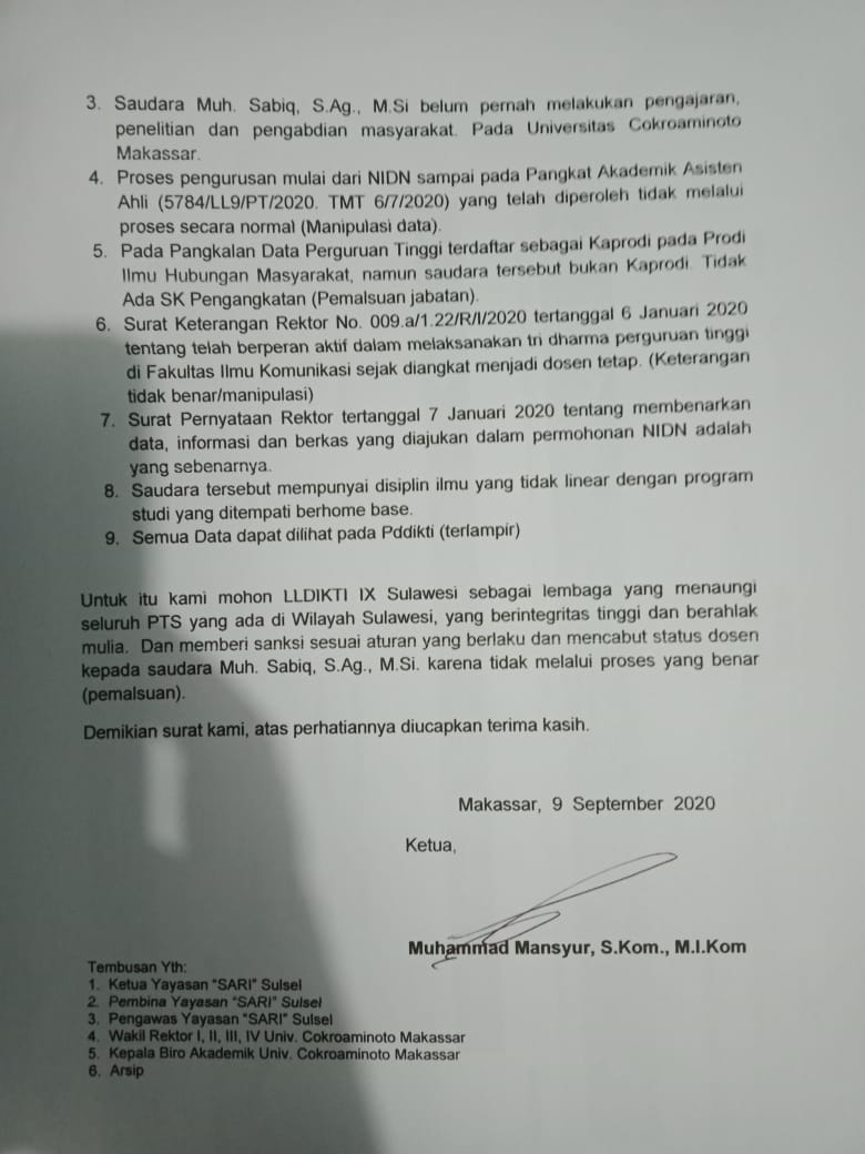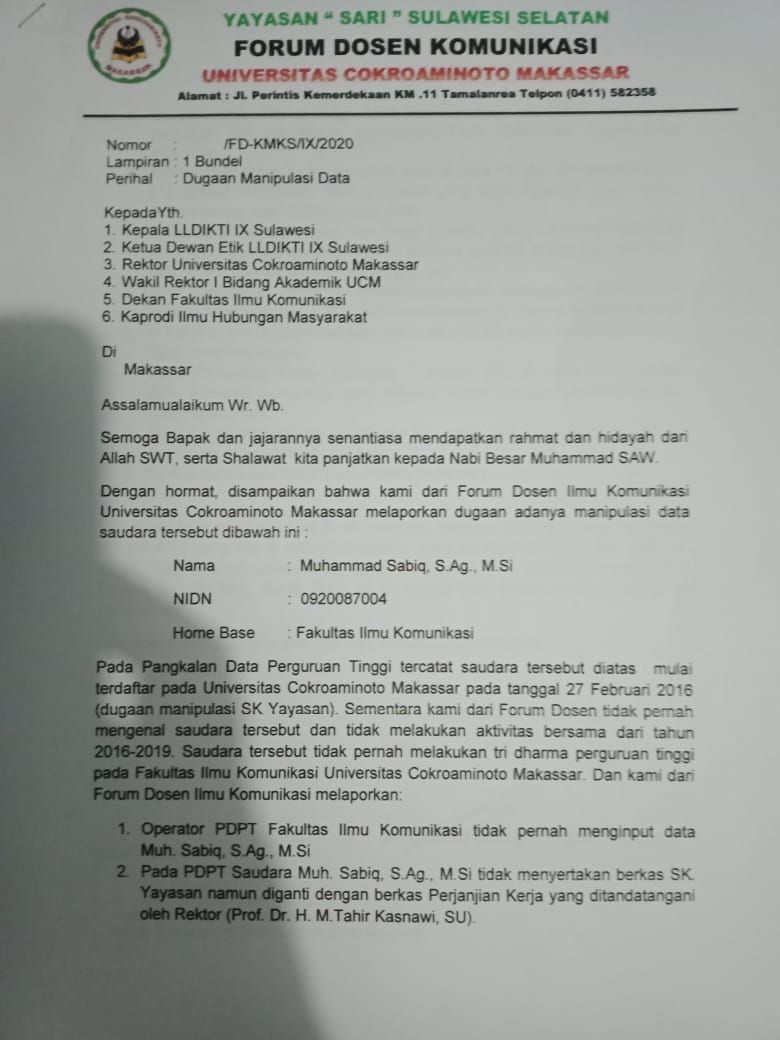 Makassar,Sulawesibersatu.com -Terkait permasalahan yang terjadi di Universitas Cokroaminoto Makassar (UCM) dengan adanya dugaan manipulasi data administrasi atas nama MS, Forum Dosen Ilmu Komunikasi UCM melayangkan surat dan melaporkan hal tersebut kepada Kepala LLDIKTI IX Sulawesi sebagai Lembaga yang menaungi seluruh Perguruan Tinggi Swasta (PTS) yang ada di Wilayah Sulawesi serta beberapa pihak terkait yang dianggap dapat turut andil dalam menyelesaikan persoalan ini.