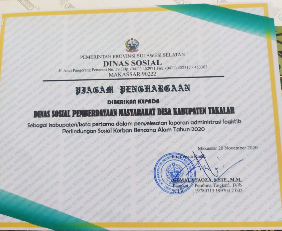 Dinas Sosial dan PMD Kabupaten Takalar mendapat Penghargaan sebagai Kabupaten/Kota pertama dalam penyelesaian laporan administrasi logistik PSKBA pada Tahun 2020 ini. Turut hadir pada kesempatan itu dari Dinas Sosial Provinsi Sulsel, para Kepala Dinas Sosial dan PMD serta para petugas logistik.