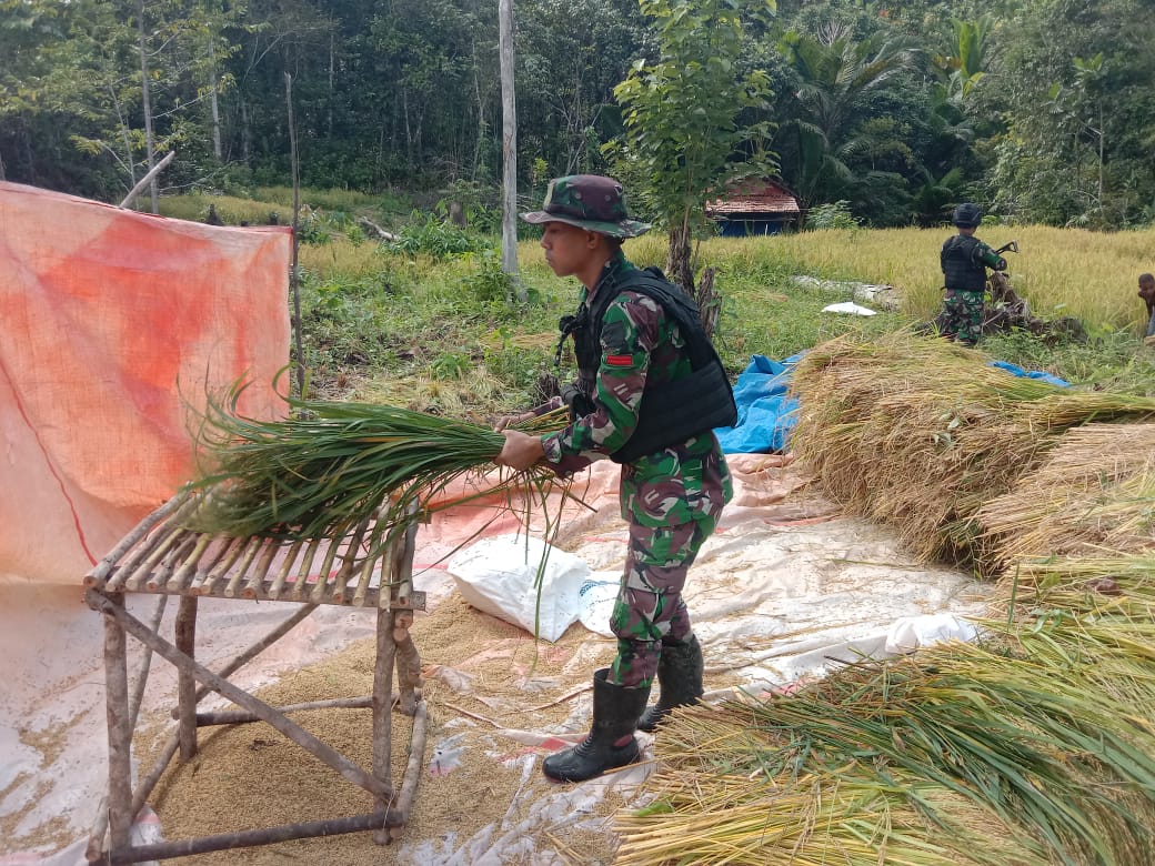 Dukung Ketahanan Pangan, Satgas Yonif 725/Woroagi Bantu Petani Panen Padi Di Perbatasan