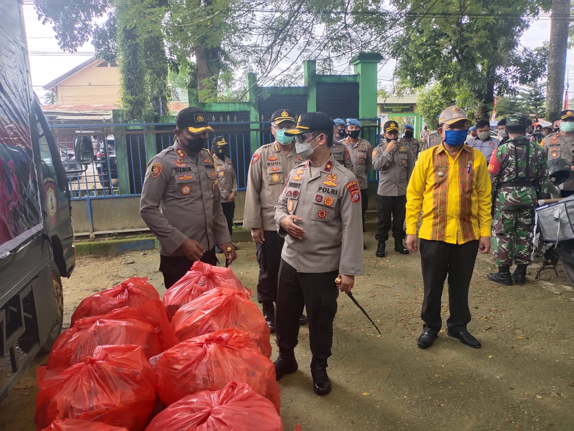 Waka Polda didampingi Dir Bimas, Dir narkoba,Kabid Humas serta Camat dan lurah kampung salo juga menyerahkan paket sembako kepada Babinkamtibmas dan Babinsa yg akn diserakan ke warga kampung salo yg berhak .