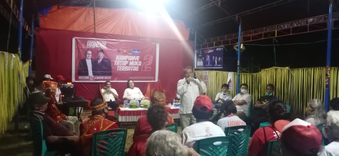 Meski demikian, tampak jumlah warga dalam tenda tetap sesuai aturan kampanye tatap muka terbatas yaitu, 50 orang saja. Akan tetapi ratusan orang yang berada diluar tenda disekitar area kampanye, ditengah derasnya guyuran hujan tidak mempengaruhi antusias warga kedua desa dalam menyambut kehadiran Paslon HANDAL beserta rombongan.