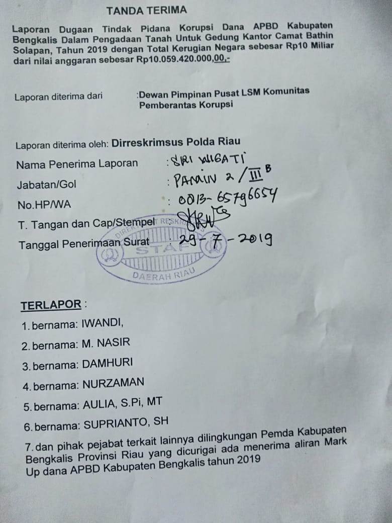 Selain laporan resmi yang diterima Ditreskrimsus Polda Riau, LSM Komunitas Pemberantas Korupsi yang dibawahi Pimpinan Redaksi Harian Berantas, juga melaporkan dugaan manipulasi dan kejanggalan pembayaran pembelian tanah untuk gedung kantor Camat Bathin Solapan tersebut ke Kapolda Riau, Kapolri dan Pusat Pelaporan dan Analisis Transaksi Keuangan (PPATK).