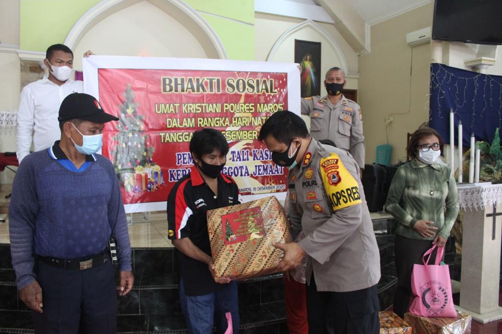 Maros,Sulawesibersatu.com-Jelang Puncak Perayaan Natal Tahun 2020,Kepolisian Resor Maros menggelar kegiatan Bakti social dengan mengunjungi Jemaat sejumlah gereja di Kabupaten Maros,Selasa (22/12/2020).