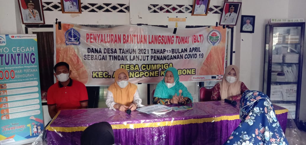 Bone Sulsel,Sulawesibersatu.com-Memasuki hari ke-10 (sepuluh) Bulan suci Ramadhan Pemerintah Desa Kecamatan Awangpone Kabupaten Bone Provinsi Sulawesi Selatan (Sulsel) melaksanakan penyaluran Bantuan Langsung Tunai (BLT) tahap IV Dana Desa (DD) di Kantor Desa Cumpiga pada Kamis (22/4/2021).