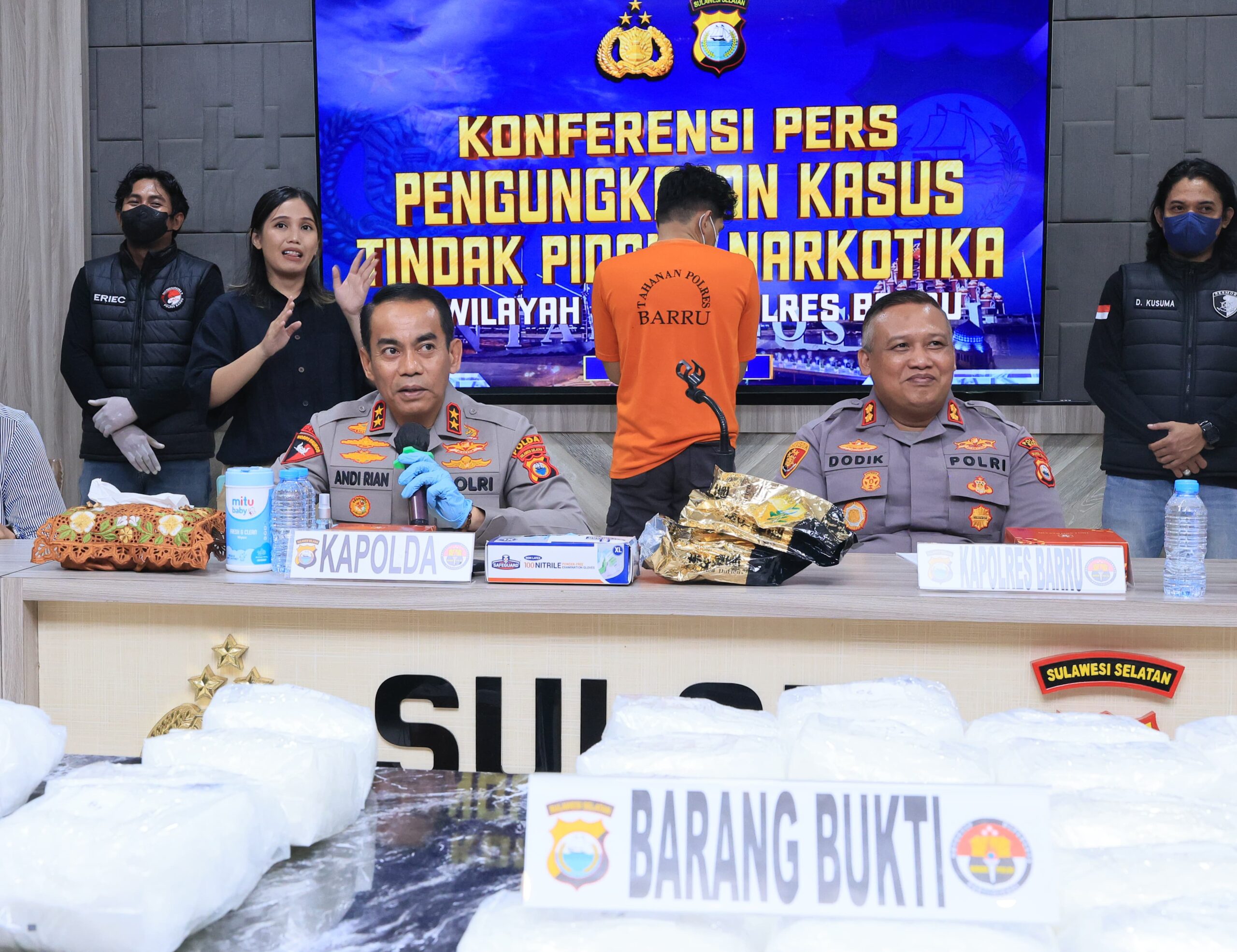 Makassar Sulsel, Sulawesibersatu.com-Kepala Kepolisian Daerah Sulawesi Selatan (Kapolda Sulsel), Irjen Pol Andi Rian R Djajadi, SIK, MH memimpin langsung kegiatan Press Release atas keberhasilan Satuan Reserse Narkoba Polres Barru menyita sebanyak 30 Kilogram (Kg) Sabu-Sabu di Dermaga Awerange Kabupaten Barru yang di gelar di ruang Lobby Mapolda Sulsel pada Selasa (30/04/2024).