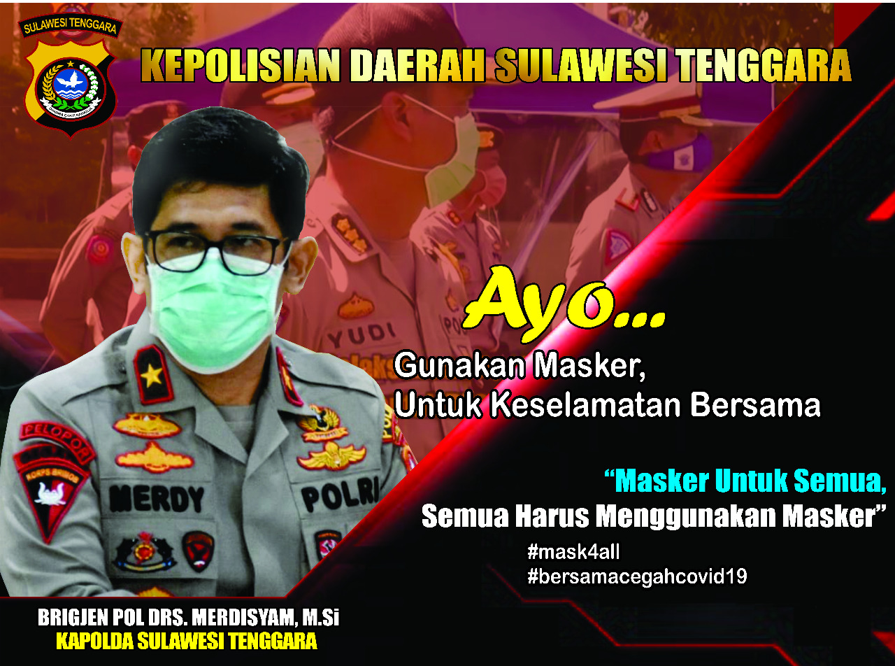 Sultra,Sulawesibersatu.com – Kepala Kepolisian Daerah (Kapolda) Sulawesi Tenggara (Sultra), Brigjen Pol. Drs. Mardisyam, M.Si menghimbau kepada seluruh lapisan masyarakat untuk menggunakan masker sebagai alat pelindung diri dari wabah corona virus disease 2019 (covid-19) saat terpaksa keluar rumah.