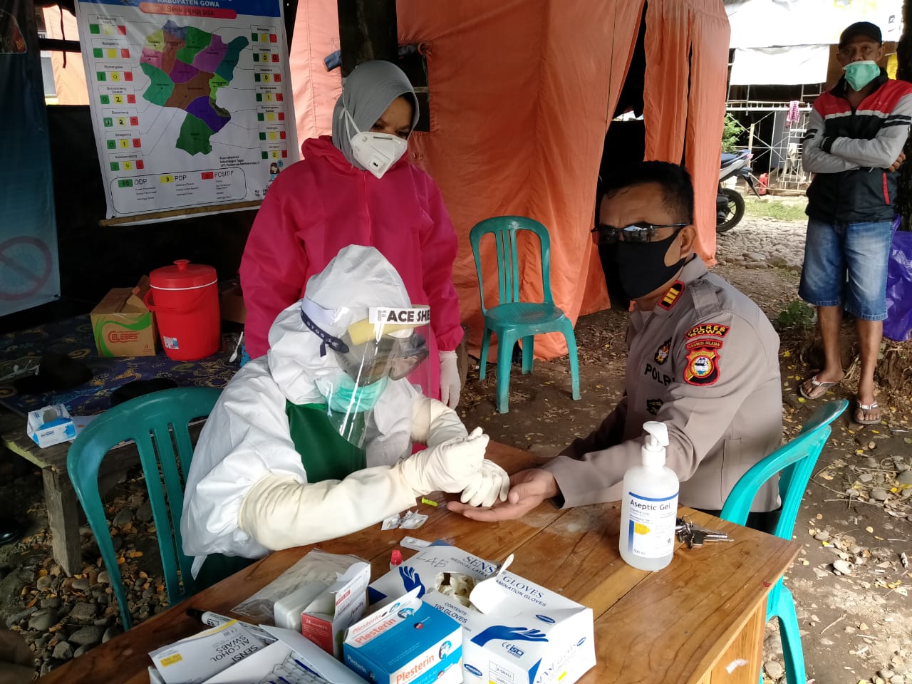 Menyadari hal tersebut, Akp Syahrir, SH turut menjalani Rapid tes yang di lakukan oleh petugas puskesmas bontonompo II di posko terpadu kec.bontonompo.