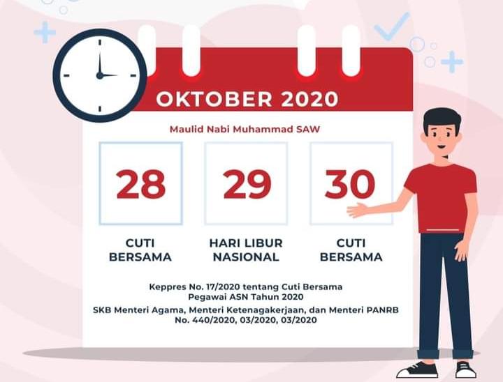 “Dalam SKB tersebut, tanggal 28 dan 30 Oktober 2020 adalah cuti bersama Maulid Nabi Muhammad SAW,” jelas Sekretaris Kementerian Pendayagunaan Aparatur Negara dan Reformasi Birokrasi (PANRB) Dwi Wahyu Atmaji dalam pernyataan tertulisnya, Selasa (27/10).
