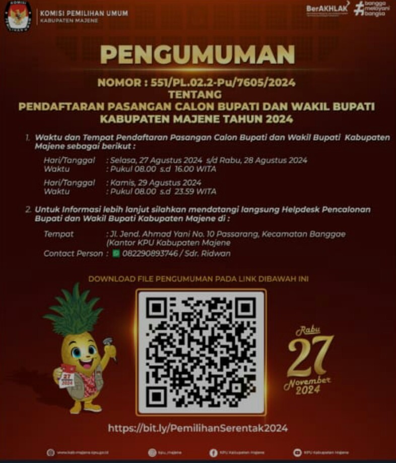 Munawir juga menyatakan jika KPU Majene berkomitmen untuk melakukan Pengawasan ketat selama proses Pendaftaran. Dirinya berharap agar semua Tim Pasangan Calon dan pihak terkait dapat bekerja sama dengan baik untuk meminimalisir potensi masalah.