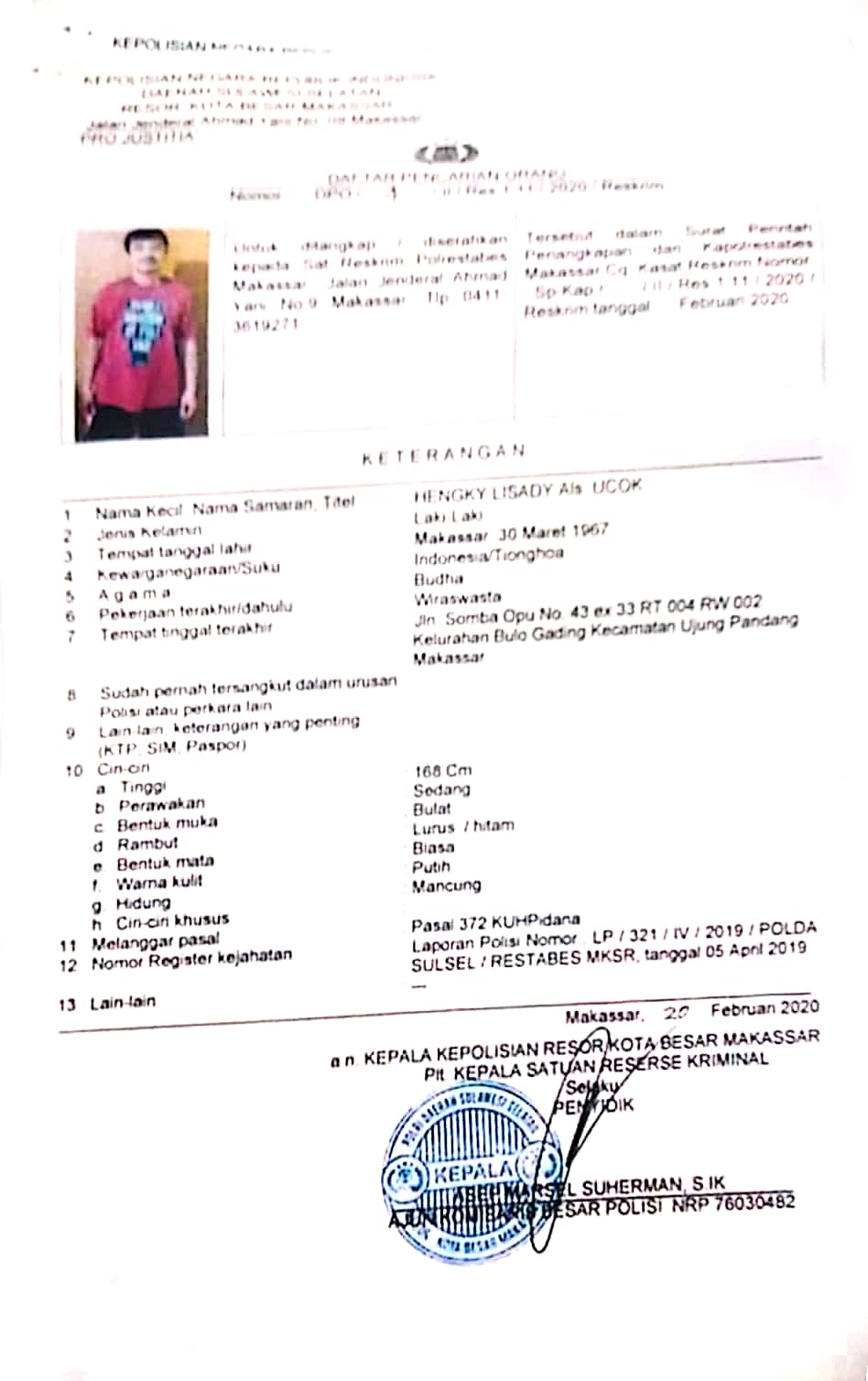 Tersangka, lanjut Hendra Syam, sudah dinyatakan DPO alias buron jadi kami menduga kalau Tersangka selama ini di sembunyikan atau dilindungi oleh Abdul Rahman Thaha yang selama ini sering menelpon kemana-mana.