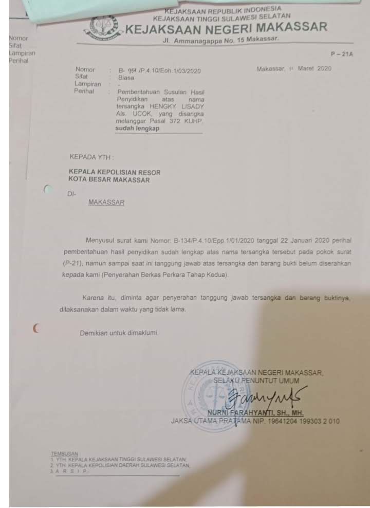 Makassar,Sulawesibersatu.com-Kasus Pidana yang sudah berstatus P21 sempat menjadi status buronan dan Daftar Pencarian Orang (DPO) akan tetapi karena dengan adanya permainan yang diduga dilakukan oleh oknum Dewan Pimpinan Daerah (DPD) Daerah Pemilihan (Dapil) Sulawesi Tengah (Sulteng), akhirnya hukum jalan ditempat alias mandek.