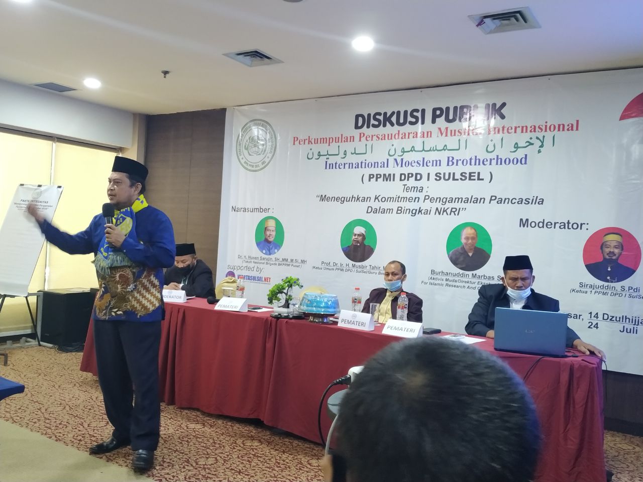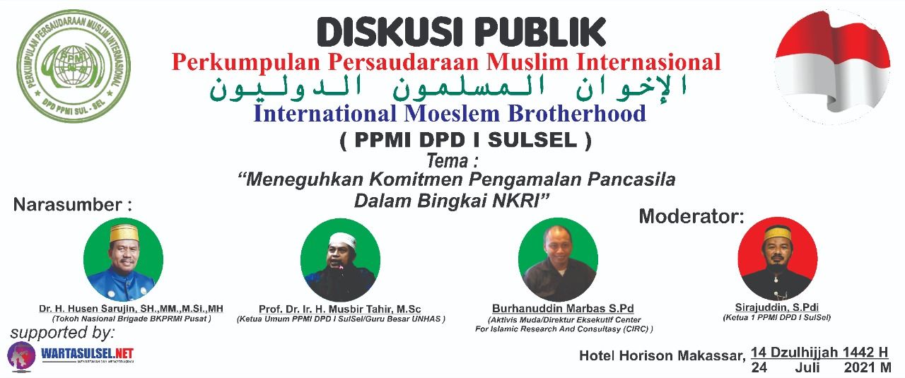 Makassar Sulsel,Sulawesibersatu.com-Dengan mengangkat tema “Meneguhkan Komitmen Pengamalan Pancasila dalam Bingkai NKRI”, International Moeslem Brotherhood atau Perkumpulan Persaudaraan Muslim Internasional Dewan Pimpinan Daerah 1 Provinsi Sulawesi Selatan (PPMI DPD I Sulsel) menggelar Diskusi Publik yang diselenggarakan di lantai 2 (dua) Hotel Horison Makassar pada Sabtu (24/7/2021) yang di Support oleh Media Online Wartasulsel.net dengan tetap melakukan Protokol Kesehatan (Prokes) ketat ditengah pandemi serta membatasi Peserta dengan tetap menjaga jarak saat acara berlangsung.