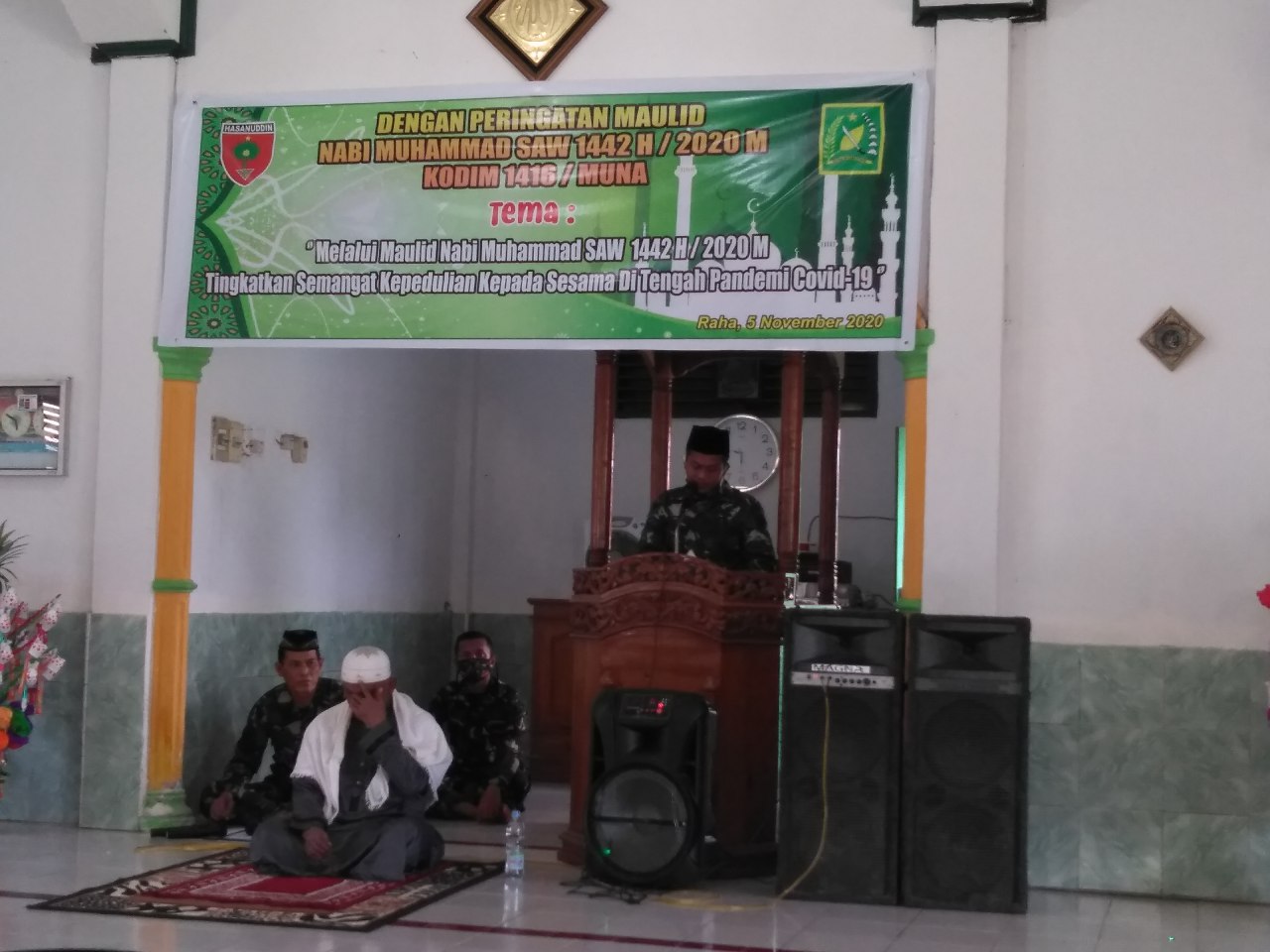 Dalam Sambutannya Komandan Kodim 1416/Muna, Letkol Arm Andi Akbar SS M.Sc, mengatakan Semoga dengan adanya hikma peringatan maulid ini, saya harapkan kepada seluruh anggota dan persit, agar kita dapat mengambil hikma yang terkandung di dalamnya, dan mendengarkan ceramah ustadz, sehingga kita busa mengamalkannya dalam menungkatkan ibadah, menjauhkan diri dari perbuatan tercela, dalm kehidupan sehari-hari, sehingga dapt menunjang kegiatan kita sehari-hari sebagai prajurit TNI.