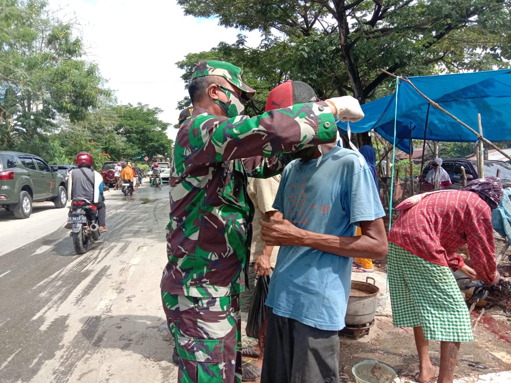 Komandan Kodim 1417/Kendari Kol Inf Drs Alamsyah M.Si memimpin dan memakaikan masker langsung kepada warga yang tidak mengenakan masker.Sabtu 23 Mei 2020