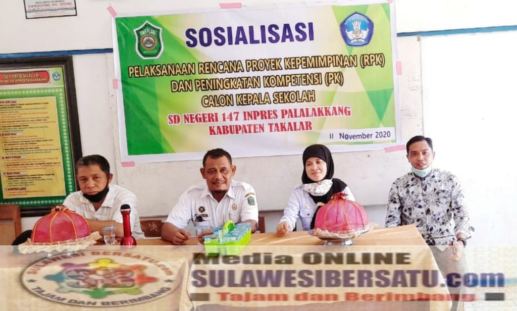 Hal itu dikemukakan dalam sambutannya ketika menggelar Sosialisasi Rencana Proyek Kepemimpinan (RPK) dan Peningkatan Kompetensi (PK) Calon Kepala Sekolah yang dilaksanakan di ruang Kelas SDN No. 147 Inpres Pa’lalakkang yang berlokasi di Dusun Jempang Desa Kalukuang Kecamatan Galesong Kabupaten Takalar pada Rabu (11/11/2020) dengan memberikan arahan dan motivasi untuk memajukan Sekolahnya.