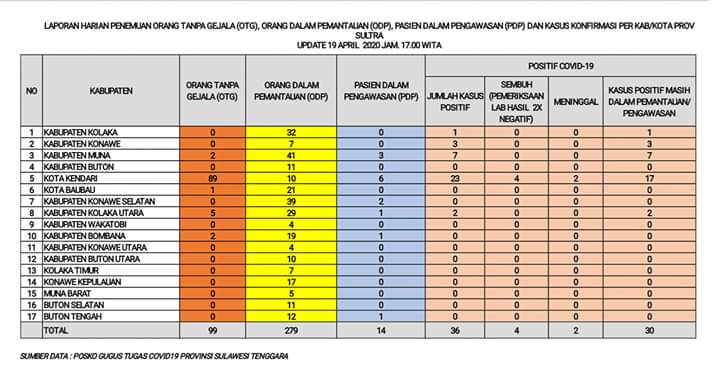 Sultra,Sulawesibersatu.com –Sore ini 19 april 2020 Pukul 17:00 Wita,dilaporkan bahwa kasus terkonfirmasi positif Covid-19 mengalami peningkatan dengan tambahan 9 kasus baru yakni 7 kasus baru asal Kab. Muna dan 2 kasus baru untuk Kota Kendari,sehingga total keseluruhan berjumlah 36 kasus dalam hal ini 30 jiwa sedang berada dalam PERAWATAN, 4 orang dinyatakan SEMBUH dan 2 orang meninggal dunia.