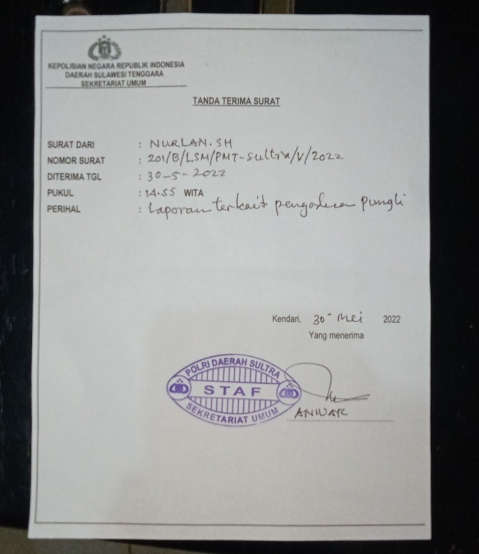 Ketua Umum LSM LPMT SULTRA, NURLAN,Mengatakan “Kami Sudah Mengajukan Surat Aduan Kepada KAPOLDA SULTRA Terkait Pungutan Liar (PUNGLI) Yang Diduga Dilakukan Oleh Oknum ASPENTU Dan Oknum Kepala Desa Poni-poniki” ucapnya
