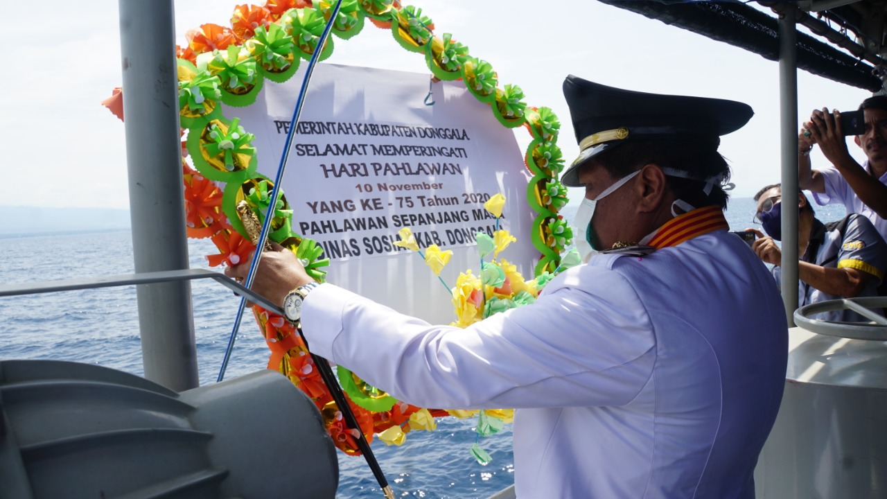 Sebelum melaksanakan tabur bunga, terlebih dahulu seluruh hadirin melaksanakan Upacara Hari Pahlawan di Dermaga Kabupaten Donggala dengan Irup Bupati Donggala Drs. H. Kasman Lasa, S.H., M.H., yang dihadiri anggota Forkompinda Kabupaten Donggala.