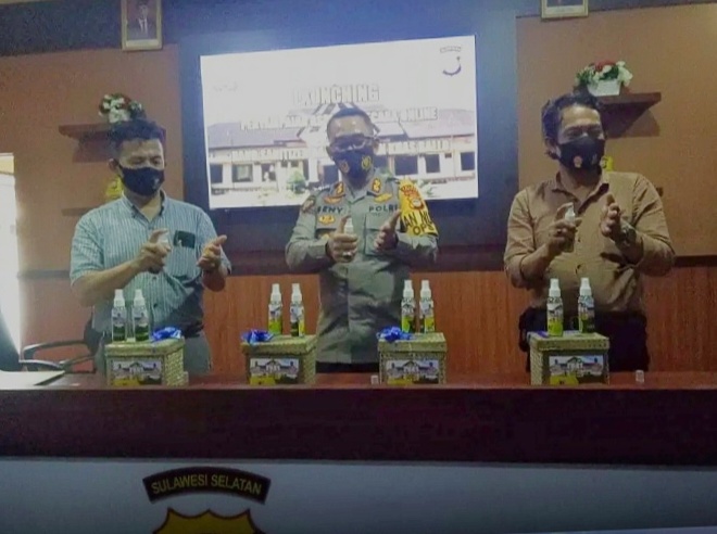 Takalar Sulsel,Sulawesibersatu.com-Hand Sanitizer adalah salah satu cairan antiseptik yang merupakan disinfektan dengan kandungan jenis alkohol yang terbilang sangat tinggi. Hal inilah yang membuat Polisi Resort (Polres) Takalar menciptakan suatu terobosan dari minuman khas suku makassar Tuak Ballo’ menjadi Hand Sanitizer.