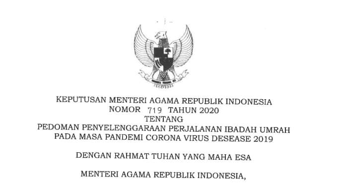 Jakarta, Sulawesibersatu.com – Menteri Agama Fachrul Razi mengeluarkan Keputusan Menteri Agama (KMA) Nomor 719 Tahun 2020 tentang Pedoman Penyelenggaraan Perjalanan Ibadah Umrah pada Masa Pandemi Corona Virus Desease 2019. Keputusan tersebut ditandatangani pada tanggal 27 Oktober 2020.