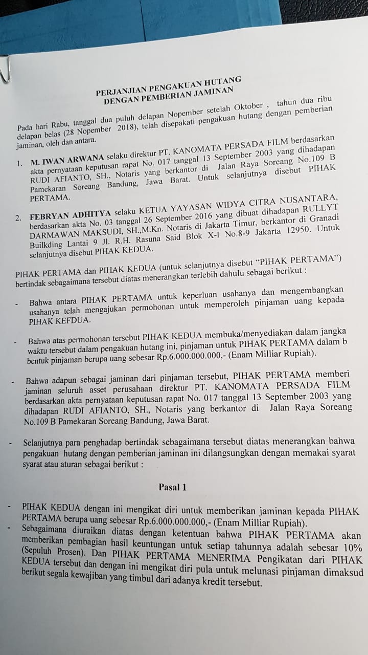 “Atas dasar itu saya menerima transferan dana untuk mengurus seluruh keperluan legalitas pinjam perusahaan agar memenuhi syarat pinjaman,” ungkap Febryan yang juga menjabat sebagai Ketua Umum Karyawan Film dan Televisi atau KFT.