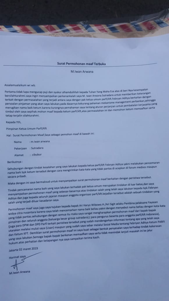 Penasehat DPP SPRI ini juga menyayangkan sikap Arwana yang masih saja terus menyalahkannya di media sosial. Padahal Awana sendiri sudah pernah membuat permintaan maaf secara tertulis atas tindakannya mencemarkan nama baik Febryan Adhitya. (***)