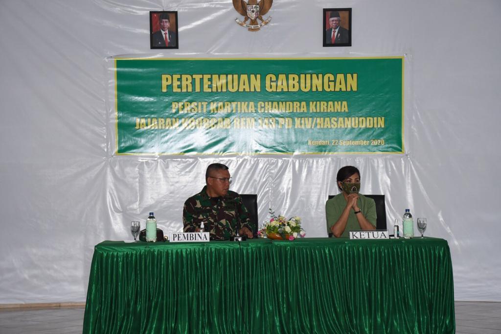 Kendari,Sulawesibersatu.com – Dalam rangka pertemuan gabungan Persit KCK Jajaran Koorcab Rem 143 PD XIV/Hsn yang diselenggarakan di Aula Sudirman Korem 143/HO, Kota Kendari, Sultra, Selasa (22/9/2020) dalam sambutan Ketua Persit KCK Koorcab Rem 143 PD XIV/Hsn Ny Vera Jannie Aldrin Siahaan mengatakan bahwa menjadi seorang isteri prajurit harus dapat hidup mandiri agar suami dapat berkonsentrasi penuh terhadap tugasnya.