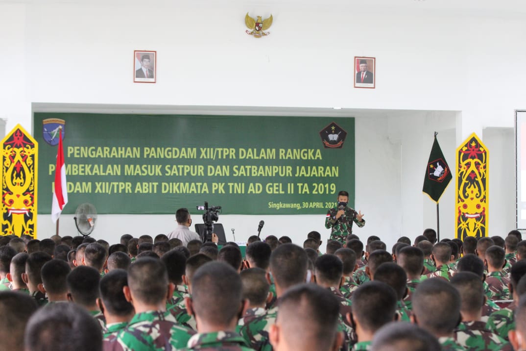 Singkawang,Sulawesibersatu.com –  Jum’at (30/4/21) –  Panglima Kodam XII/Tanjungpura, Mayjen TNI Muhammad Nur Rahmad memberikan pengarahan kepada para Prajurit Tamtama Abituren Dikmata PK TNI AD GEL II TA. 2019 bertempat di Aula Dodik Bela Negara Rindam XII/Tpr, Kota Singkawang. Pengarahan ini dilakukan dalam rangka pembekalan masuk Satpur dan Satbanpur jajaran Kodam XII/Tpr.