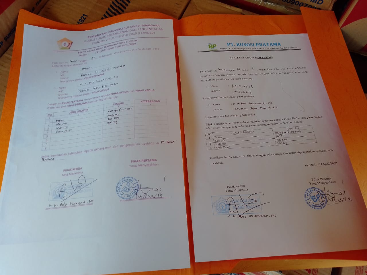 Pemberian bantuan paket sembako diserahkan oleh Direktur PT Bososi Pratama melalui Humas Darwis, dan diserahkan langsung kepada Ketua Harian Satgas Covid-19, Ir. H. Boy Ihwansyah, MT, bertempat di media center yang terletak di jalan Ahmad Yani, Kelurahan Mandonga, Kota Kendari.