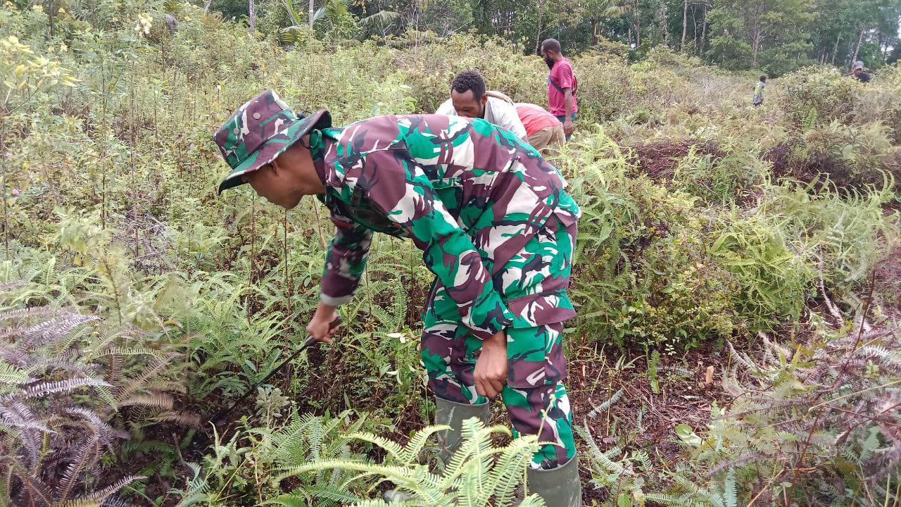 Boven Digoel,fokustime.com – Satgas Pamtas RI-PNG Yonif 725/Woroagi yang berada di bawah naungan Komando Korem 174/ATW, Pos Kombut bersama masyarakat di perbatasan melaksanakan Karya Bakti rutin yang dilaksanakan setiap hari jum’at dalam rangka menjaga kebersihan di lingkungan Kampung Kombut, yang dilaksanakan di Kampung Kombut, Distrik Kombut, Kab. Boven Digoel.Jum’at, 17 Maret 2023,