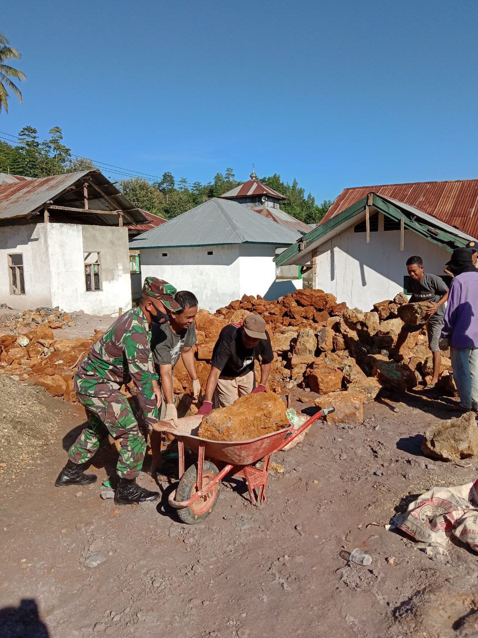 Konawe,Fokustime.com_ Dalam membantu meringankan beban warga, Babinsa Koramil 1417-03/Lambuya Serda Dirhamsyah bersama warga melaksanakan kerja bakti membangun Masjid Al-Ikhsan di Desa Tanggobu, Kec. Lambuya, Kab. Konawe, Kamis (05/08/2021).