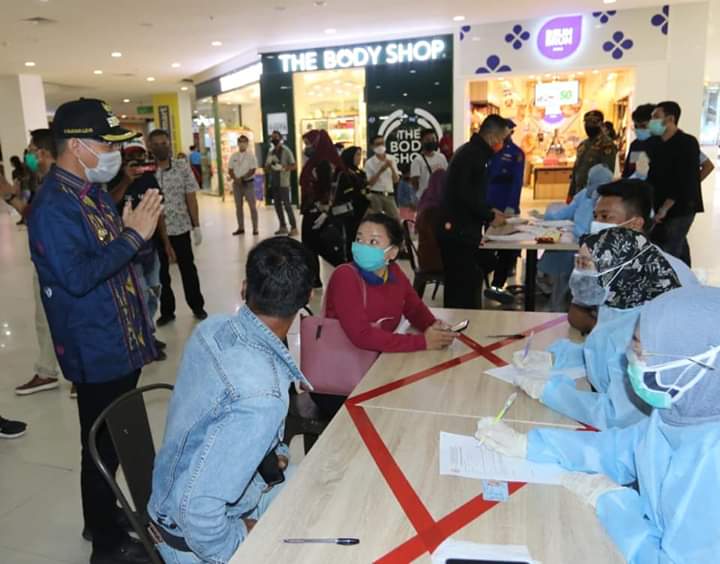 Wali Kota Kendari H. Sulkarnain K, SE., ME, Bersama Dandim 1417/Kendari, Kadis Kesehatan, dan Ketua IDI Kendari turut melakukan rapid tes bersama dengan karyawan dan pengunjung mall.