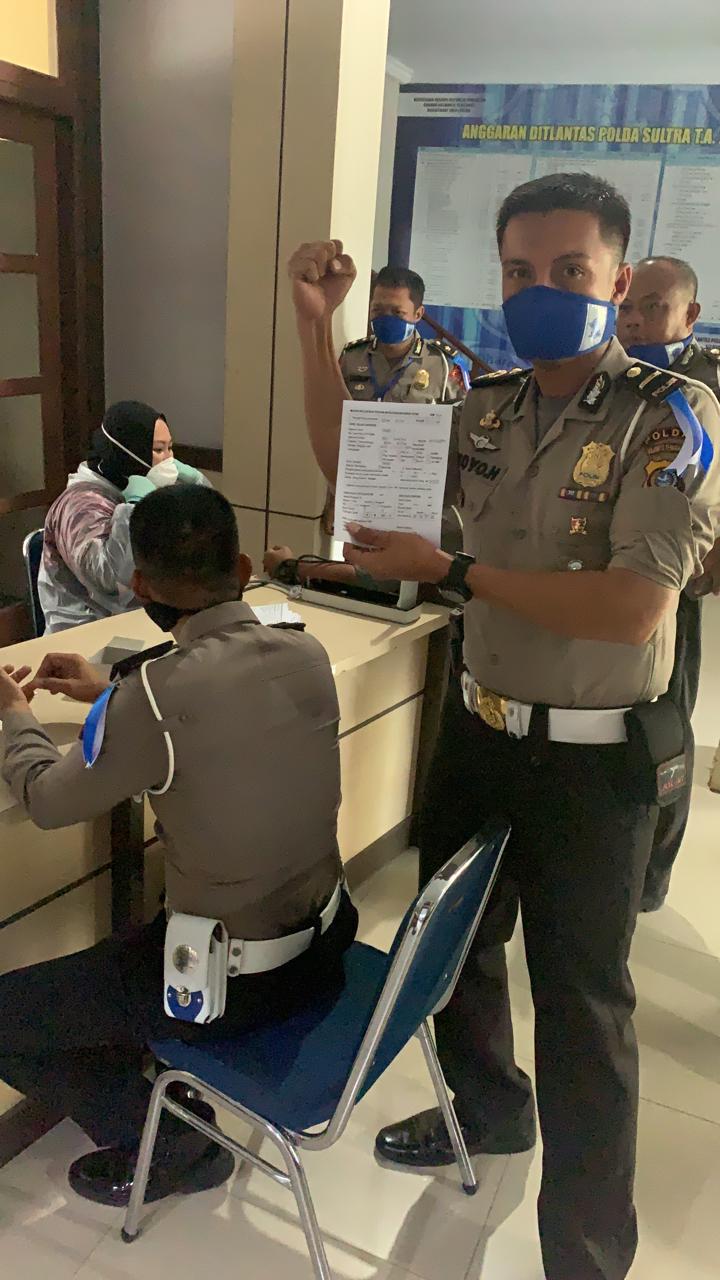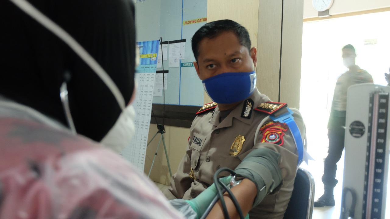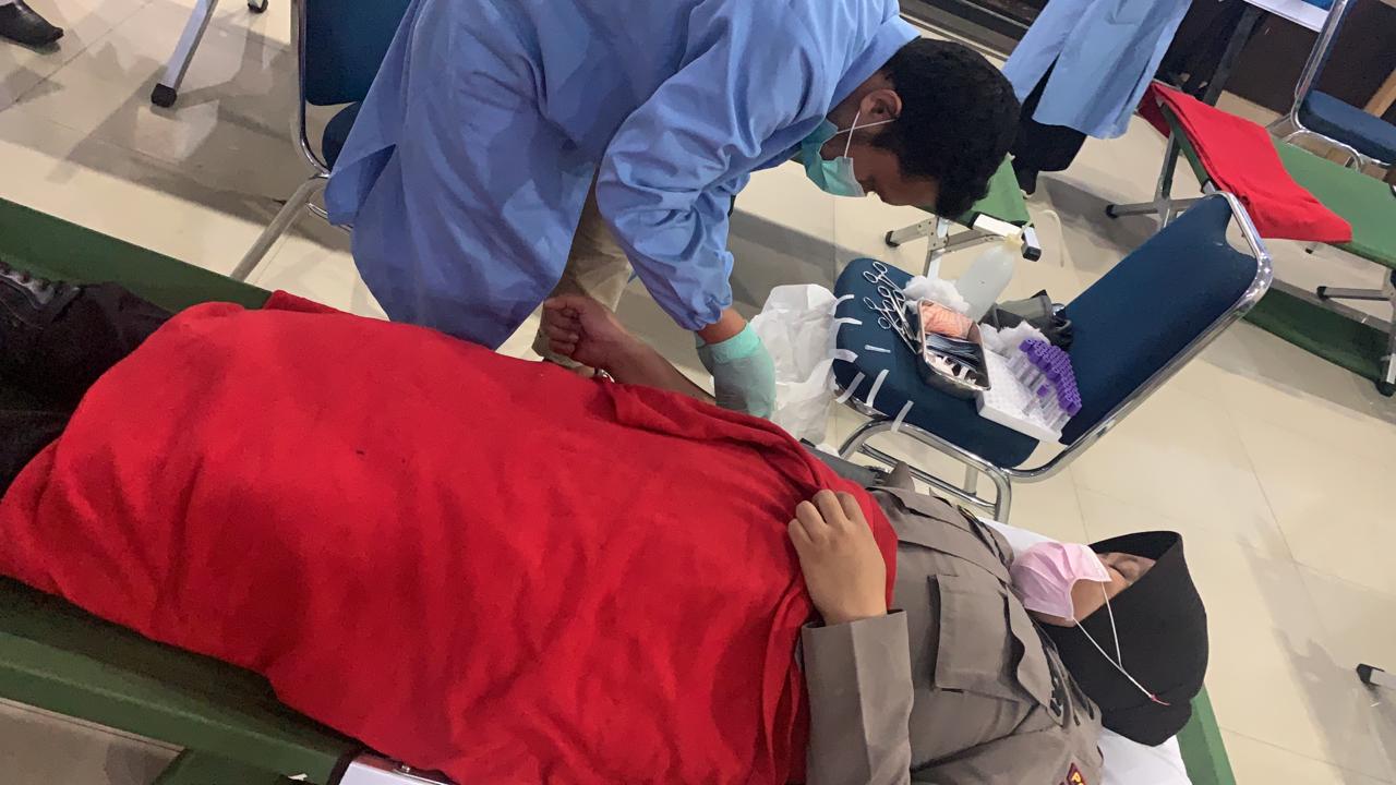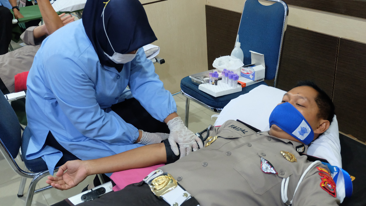 Kegiatan donor darah yang di lakukan oleh polda sultra untuk membantu pemenuhan kebutuhan darah bagi penderita Virus Corona ( Covid 19 ).