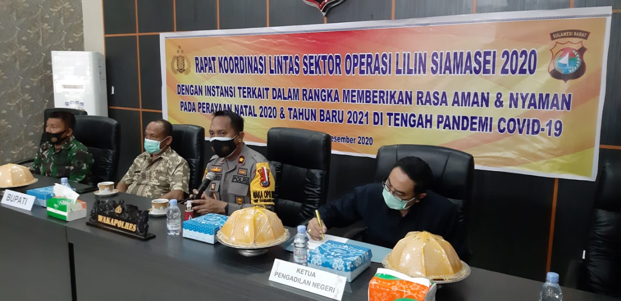 PASANGKAYU,Sulawesibersatu.com – Polres Pasangkayu menggelar Rapat Koordinasi Lintas Sektor Operasi Lilin Siamasei 2020 yang dilaksanakan di Aula Rupatama Polres Pasangkayu dalam rangka persiapan Pengamanan Natal 2020 dan Tahun Baru 2021. Kamis Pagi (17/12/2020).