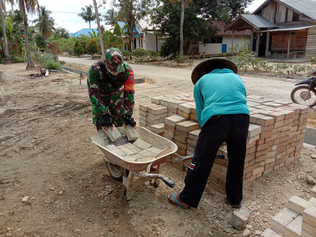 Konawe,Sulawesibersatu.com_ Jalin Kebersamaan menyambut hari Raya idul Fitri 1442 Hijriah, Bintara Pembina Desa (Babinsa) Koramil 1417-07/Unaaha jajaran Kodim 1417/Kendari Peltu Rusli bersama warga bergotong-royong dalam melaksanakan Pemasangan paving blok masjid As-Salam di Desa Anggohu Kec.Tongauna Utara, Kab. Konawe, Selasa (04/05/2021).