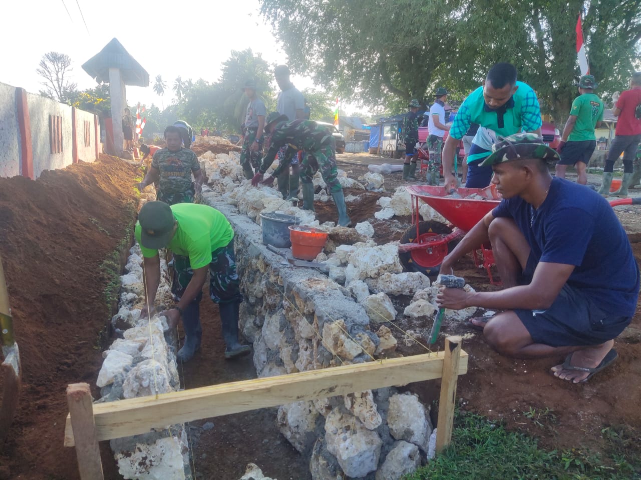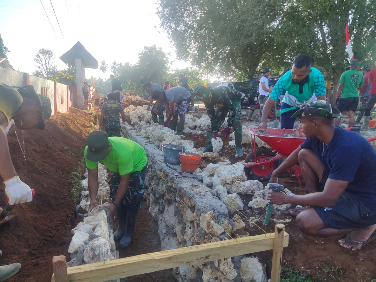 Tampak anggota Satgas bersama warga berbagi tugas, ada yang mengangkat material, mengaduk semen dan memasang batu.