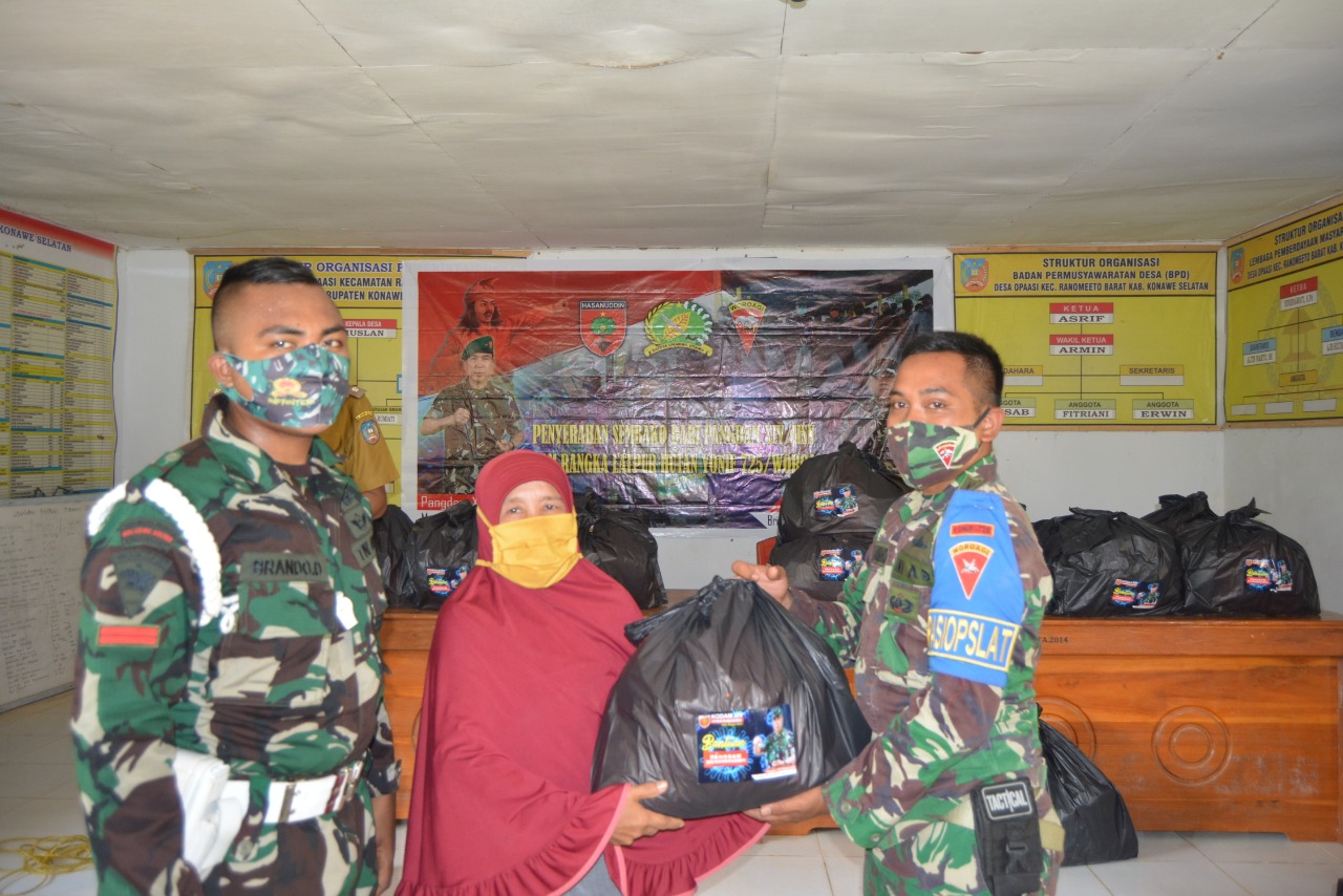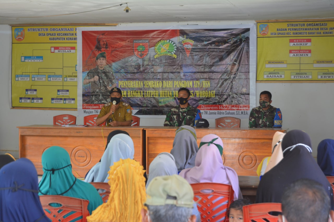 KENDARI,Sulawesibersatu.com – Sebagai puncak kegiatan latihan Pertempuran Hutan (Purhutan), Prajurit Batalyon Infanteri (Yonif) 725/Woroagi (Wrg) menyerahkan bingkisan sembako dari Pangdam XIV/Hasanuddin, Mayjen TNI Andi Sumangerukka, S.E., kepada masyarakat Ds. Opaasi, Kec. Ranomeeto Barat, Kab. Konsel sebagai ucapan terima kasih. Selasa, (17/11/2020).