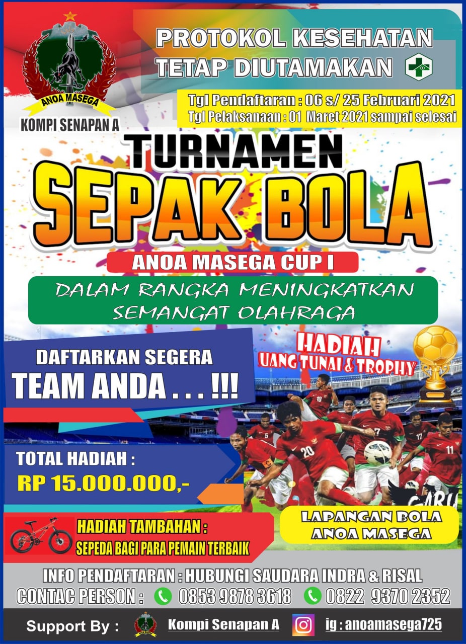 Untuk diketahui, pendaftaran dibuka sejak hari ini Sabtu, (6/2) sampai dengan tanggal 25 Februari 2021 nanti. Bagi yang ingin mendaftarkan Club/Timnya bisa langsung menghubungi nomor ini, 085398783618 /082293702352. Tournamen Anoa Cup I Ini dibuka untuk umum.